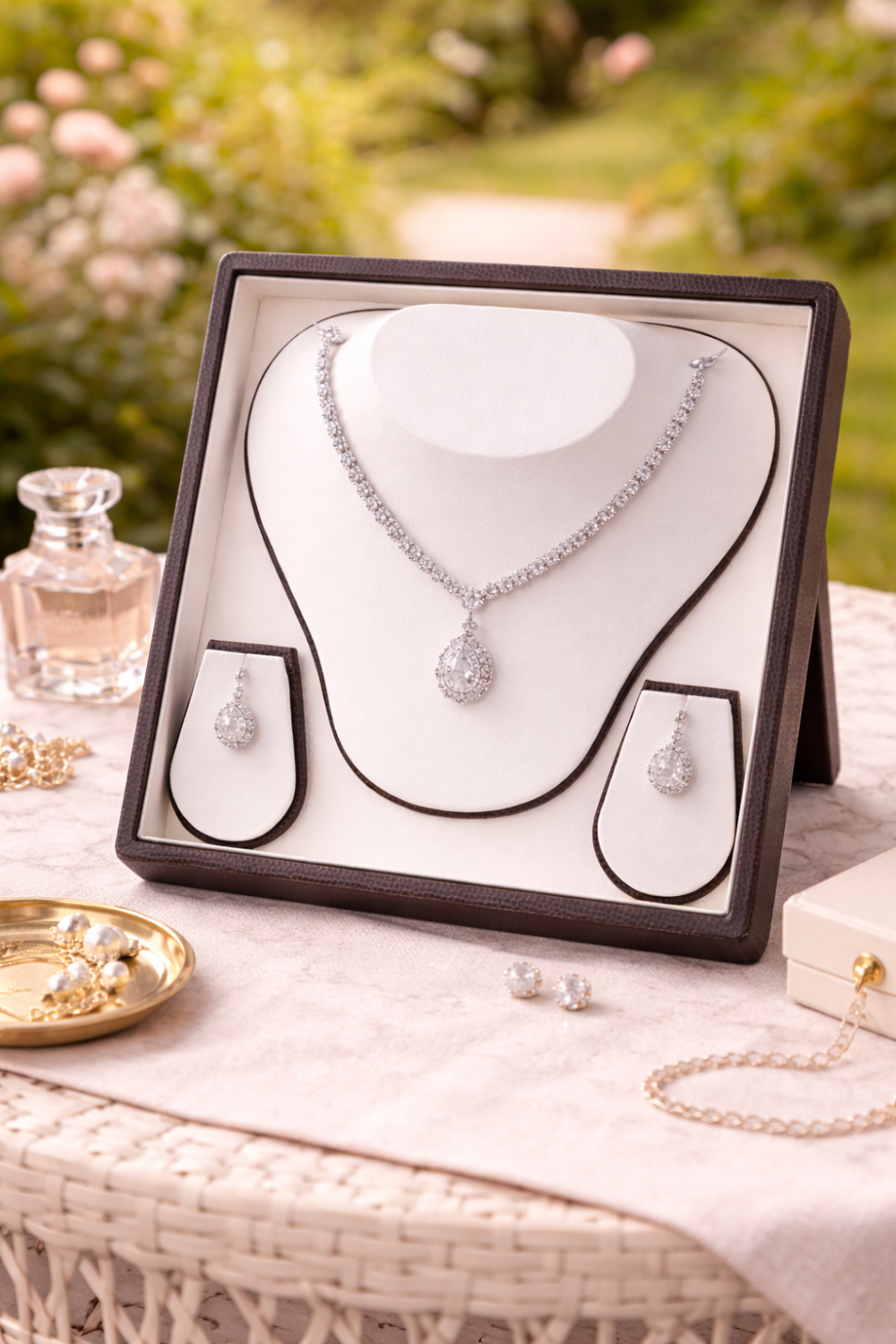 This premium jewelry display set is designed to present necklaces and earrings in a clean, elegant, and professional way. Featuring a soft padded surface with a sleek frame, it enhances the visibility and appeal of your jewelry while keeping it securely in place.