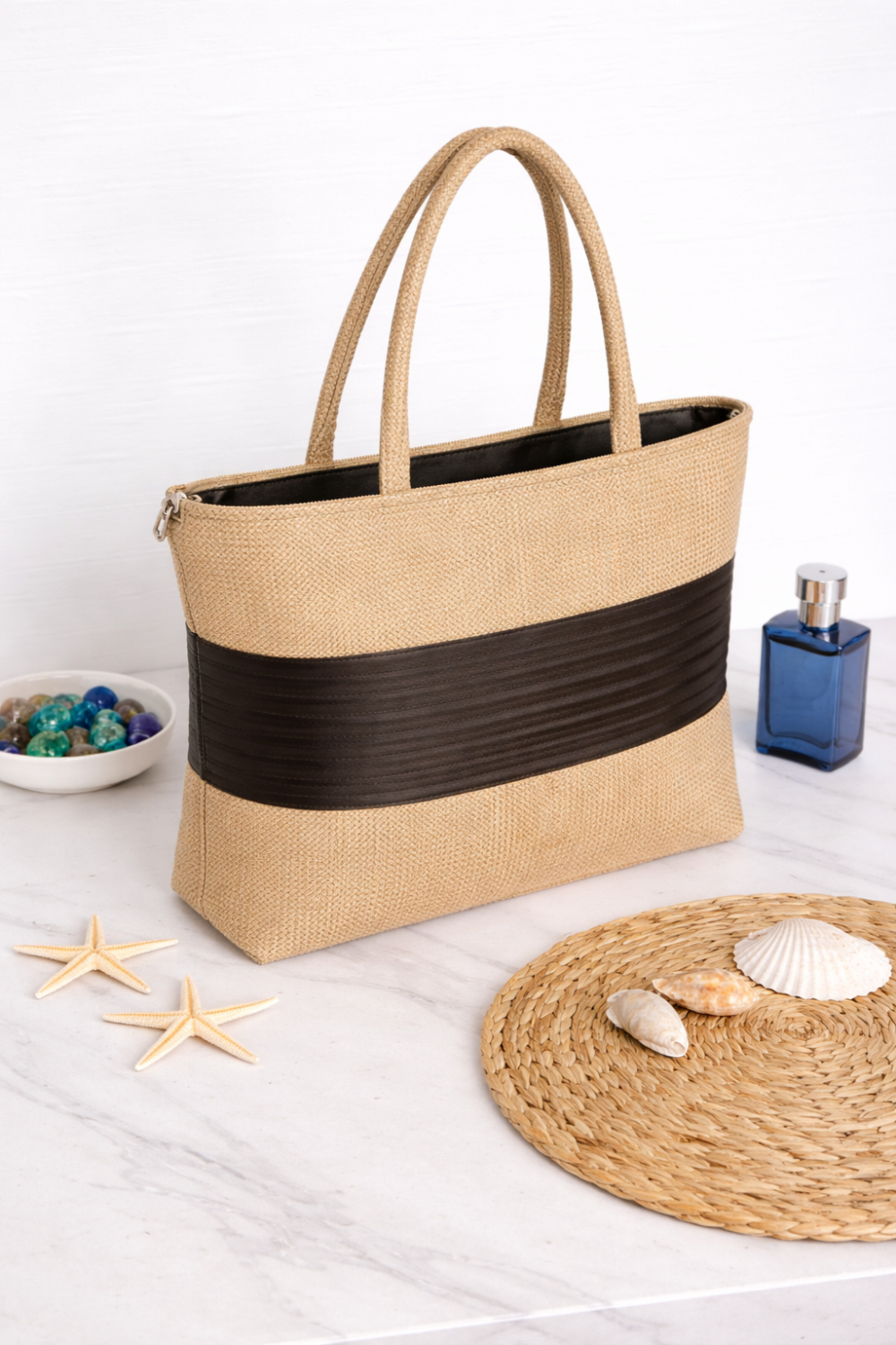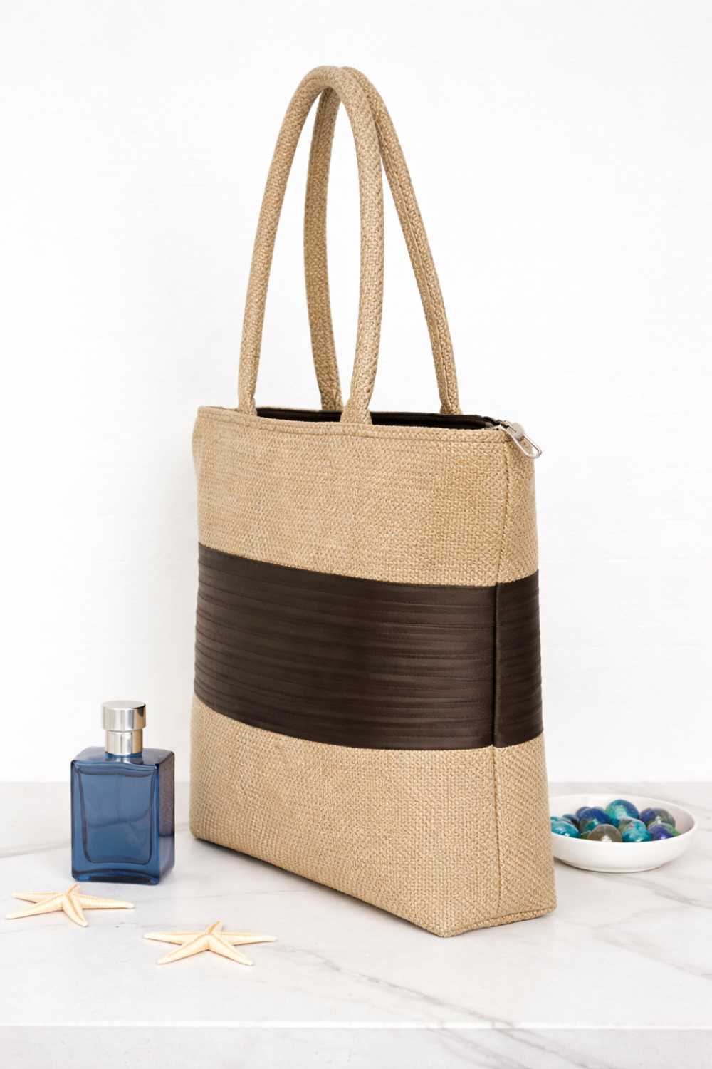 This premium jute designer tote bag is a perfect combination of natural elegance and modern style. Crafted from eco-friendly jute material, it features a beautifully textured finish complemented by a stylish contrasting panel, giving it a sophisticated and trendy look. Ideal for daily use, shopping, or casual outings, this bag adds a touch of class to any occasion.